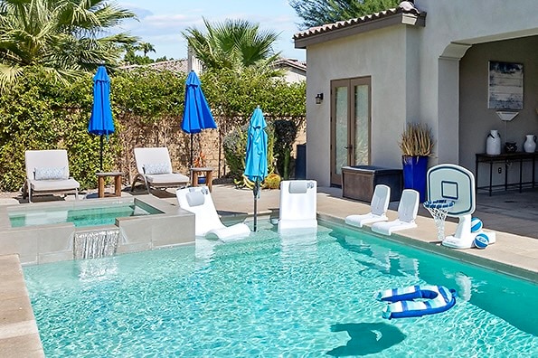 Brand newly decorated and updated 3020 sq. ft. executive home on the PGA West Nicklaus Course. Extra tall 12’ ceilings and beautiful design make this desert vacation home a luxury getaway. The perfect family getaway with a custom designed modern pool and sun shelf for little ones, with child safety alarms on doors to the pool for comfort of mind. Every detail has been considered from Kerurig coffee maker & espresso machine to the fire pit & comfortable gathering spaces for family & friends!