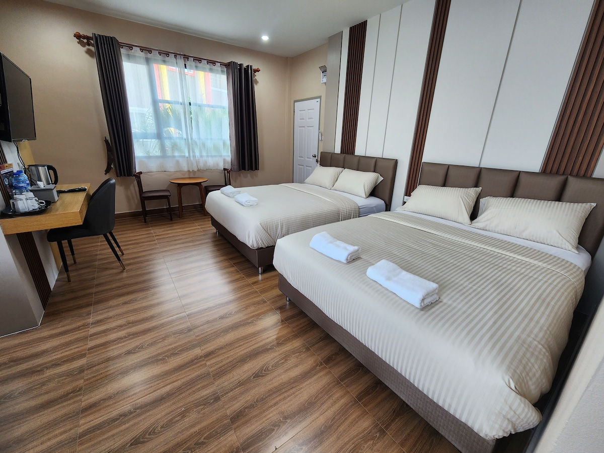 This family compact room has 1 king size bed and bunk bed allowing maximum 4 ppl to stay. The rooms provide amenities like towels, shampoo, soap Free 2 bottle of drinking water. Free wifi Large garden 24 hr security and cctv Parking space
