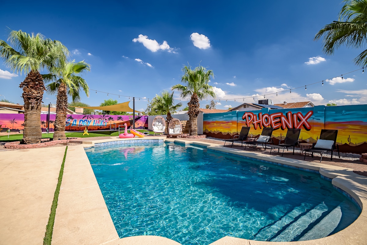 Phoenix Villa — the ultimate multi-family retreat! Dive into the pool, soak in the hot tub, or gather by the fire table. Play sand volleyball, basketball, yard games, or the 3-hole putting green, then head inside for arcade fun. With smart TVs in every bedroom and plenty of space, this villa is designed for comfort, style, and unforgettable memories. A true resort-style escape just minutes from Phoenix’s top attractions! You’ll never want to leave !!