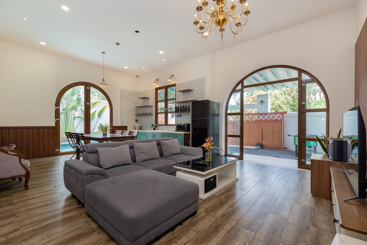Where you have a “really chill” travel experience in the coastal city of Vung Tau. House of Trees - Livin 126 Villa A modern resort garden villa with green space with trees and a large swimming pool on the premises. The swimming pool is safe for young children, designed as an outdoor bathing area. Large garden space, with outdoor BBQ dining table and chairs. Equipped with a grill and other amenities. Entertainment facilities in the villa include billiard tables, karaoke The villa is designed only on the ground floor, not upstairs.