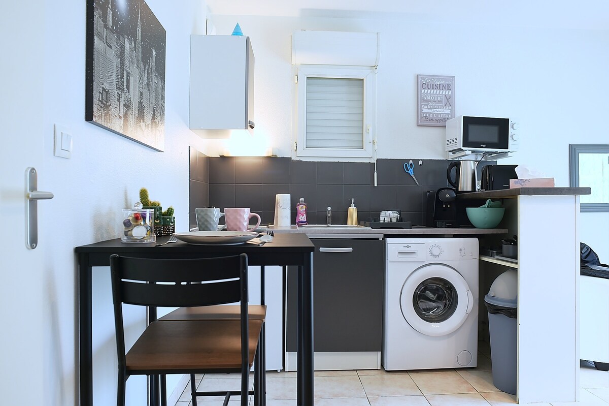 Furnished 1 bedroom on the 1st floor of a quiet residence in Léguevin (15 min from Toulouse and 5 min from Airbus by car). Close to all amenities, reserved parking in the building. Refurbished T2. Single room: New 160 x 200 memory foam bedding Kitchen area: induction stove, fridge, microwave, washing machine, coffee machine, kettle, Living room: new sofa bed, TV, Free access tennis court Cleaning carried out between each rental, Linens provided