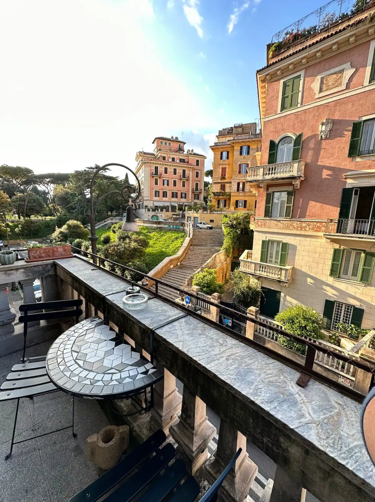 Bright and quiet penthouse apartment in the heart of Trastevere, with a wonderful terrace and an unparalleled view of charming roman roofs and the Gianicolo hill. The flat is meticulously refurbished and set in a picturesque cobblestoned street, just around the corner from the lively restaurants and cafes. La Casetta al Mattonato is located on the 3rd floor (41 steps, no elevator) of a 1600s typical roman building, within walking distance of all major attractions.