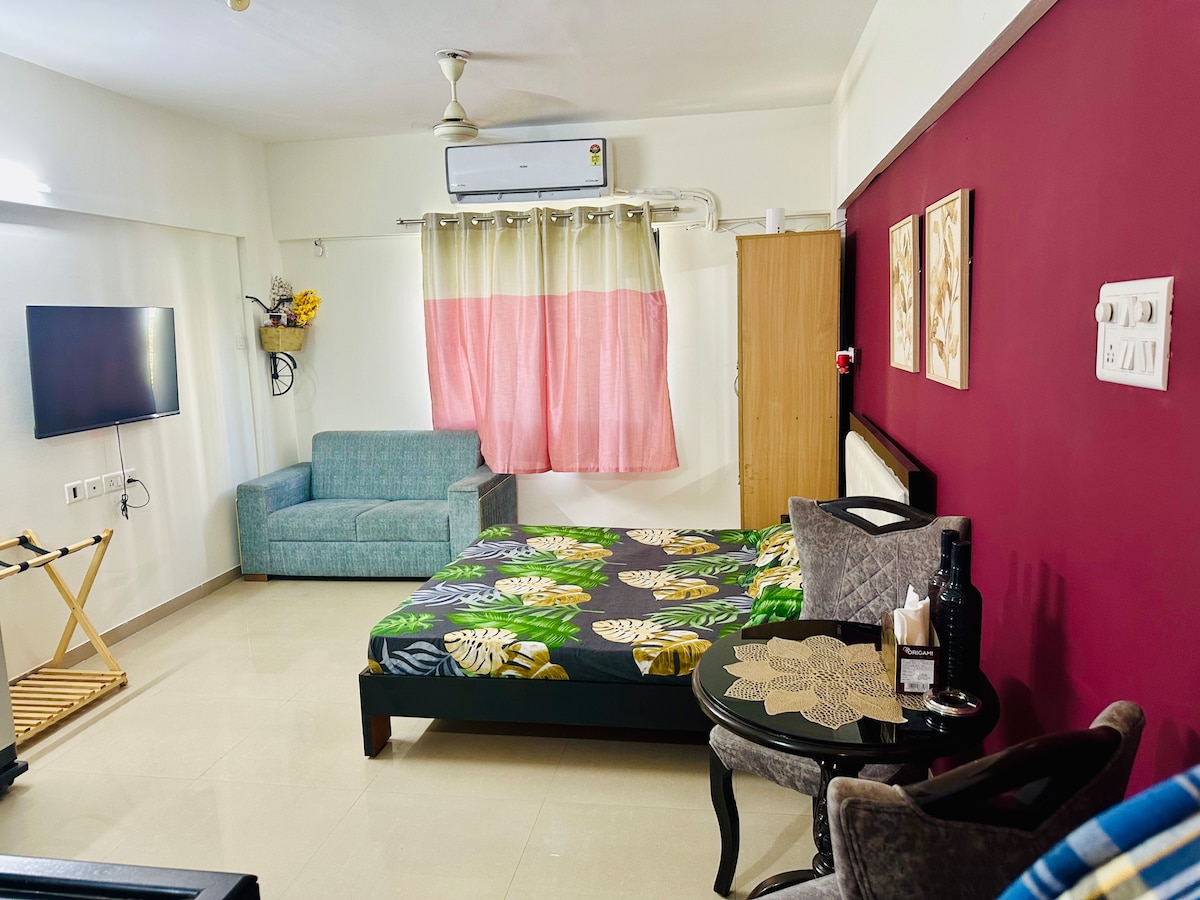 Welcome to a calm and comfortable 1BHK studio ideal for couples, families, solo travelers, friends, and remote workers. Whether you’re here for a quiet weekend, a work-from-home stay, or a longer peaceful break, this home offers the right balance of comfort, greenery, and convenience. The private balcony overlooks lush green surroundings near the golf course. With fast WiFi, OTT apps, and a quiet gated environment, it’s easy to slow down and feel at home.