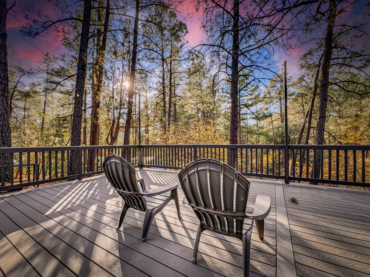 Escape city life in this cozy mountain cabin in the Tonto National Forest. Its wrap-around double deck overlooking the Mogollon Rim is great for watching sunrises, sunsets, wildlife, and stargazing. There are 2 bedrooms with queen beds (one has an ensuite bathroom), and there's a murphy bed in the library. The library has a large workspace with two desks. The cabin is the perfect base for relaxing, hiking, working remotely, visiting Fossil Creek, Tonto Natural Bridge and so much more!l