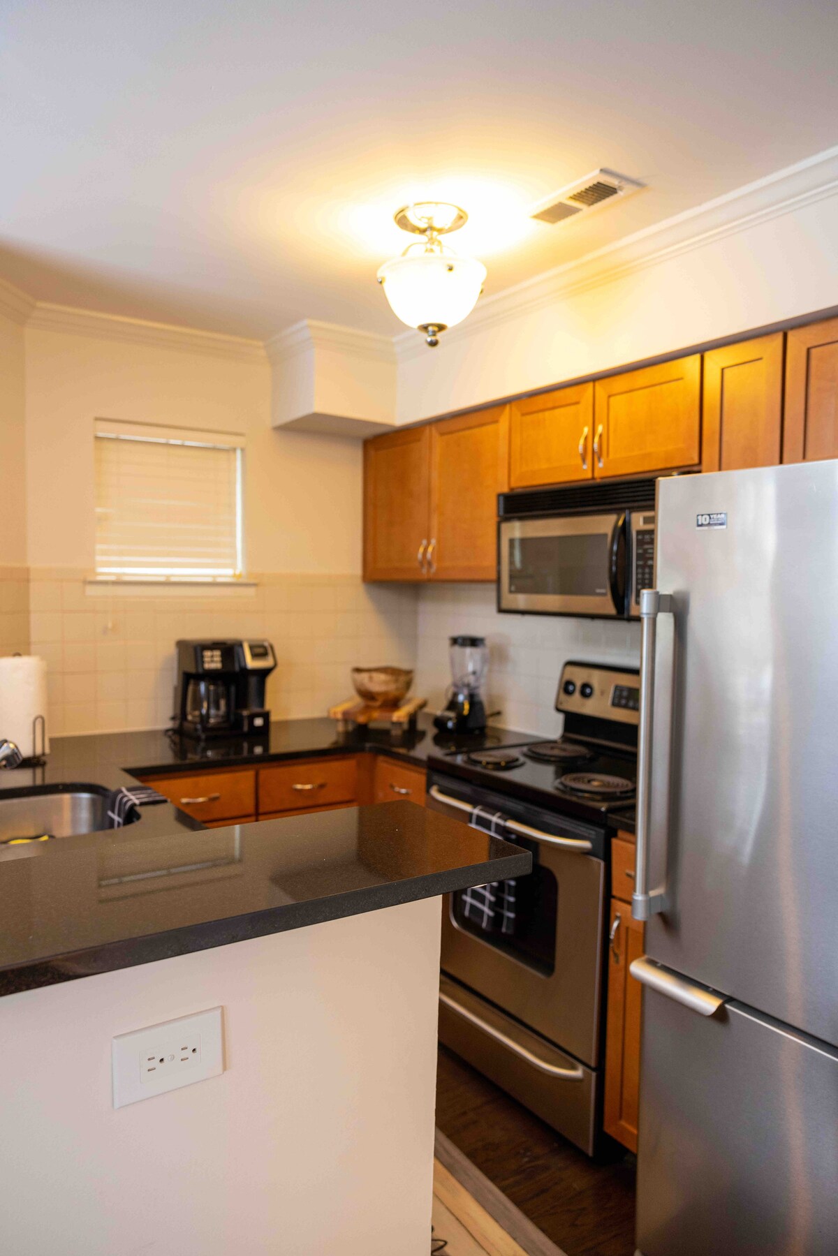 Enjoy a peaceful and stylish experience at the QC Jewel. This studio is spacious with everything you need for comfort and tranquility, overlooking the pool and spa. Conveniently located steps away from the New Bern Light Rail Station, which allows you access to the heart of Uptown, Bank of America Stadium, Fillmore Theatre, Spectrum Center, First Ward Park and more. With full scale amenities and ease of access to everything, this is the perfect location for your stay!