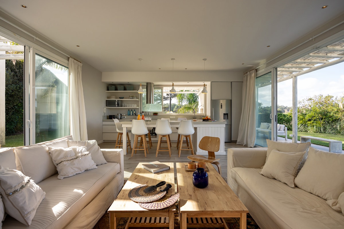 Located in the quietest area of Balneario Solís. Overlooking Cerro de las Animas from the dining room, kitchen, and bedroom. Its style is modern and functional with a double-height living room that connects through a large window with folding doors, with the deck and the large unheated pool from where you can appreciate its large park-like area in the background, inviting you to relax and enjoy the sound of birds, the sun, and nature.