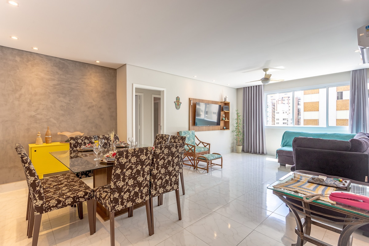 This accommodation is elegant, refined, with spectacular ocean views and is super central. It is spacious (4 en-suites), large well-equipped kitchen, laundry with washing machine, 3 rooms and a cinematic balcony. It accommodates up to 10 people. It is located in front of Pitangueiras beach in Guarujá, in the prime location surrounded by restaurants, supermarkets, pharmacies, bakeries, shops and is close to Lá Plage shopping mall. Fun and tranquility guaranteed! I'm a great host and you'll feel right at home