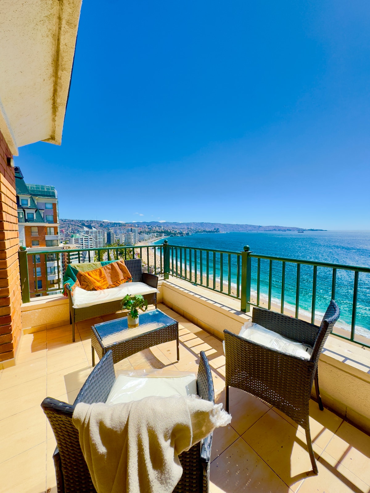 Departamento de lujo en primera línea con una de las vistas más espectaculares de Viña del Mar. Amplio y totalmente equipado para 8 personas, cuenta con 4 dormitorios, 3 baños, cocina completa, WiFi, TV y lavadora. Incluye 1 estacionamiento subterráneo y opción a un segundo sujeto a disponibilidad. El edificio ofrece piscina, gimnasio y conserjería 24/7, a pasos del Mall Marina Arauco y Av. San Martín.