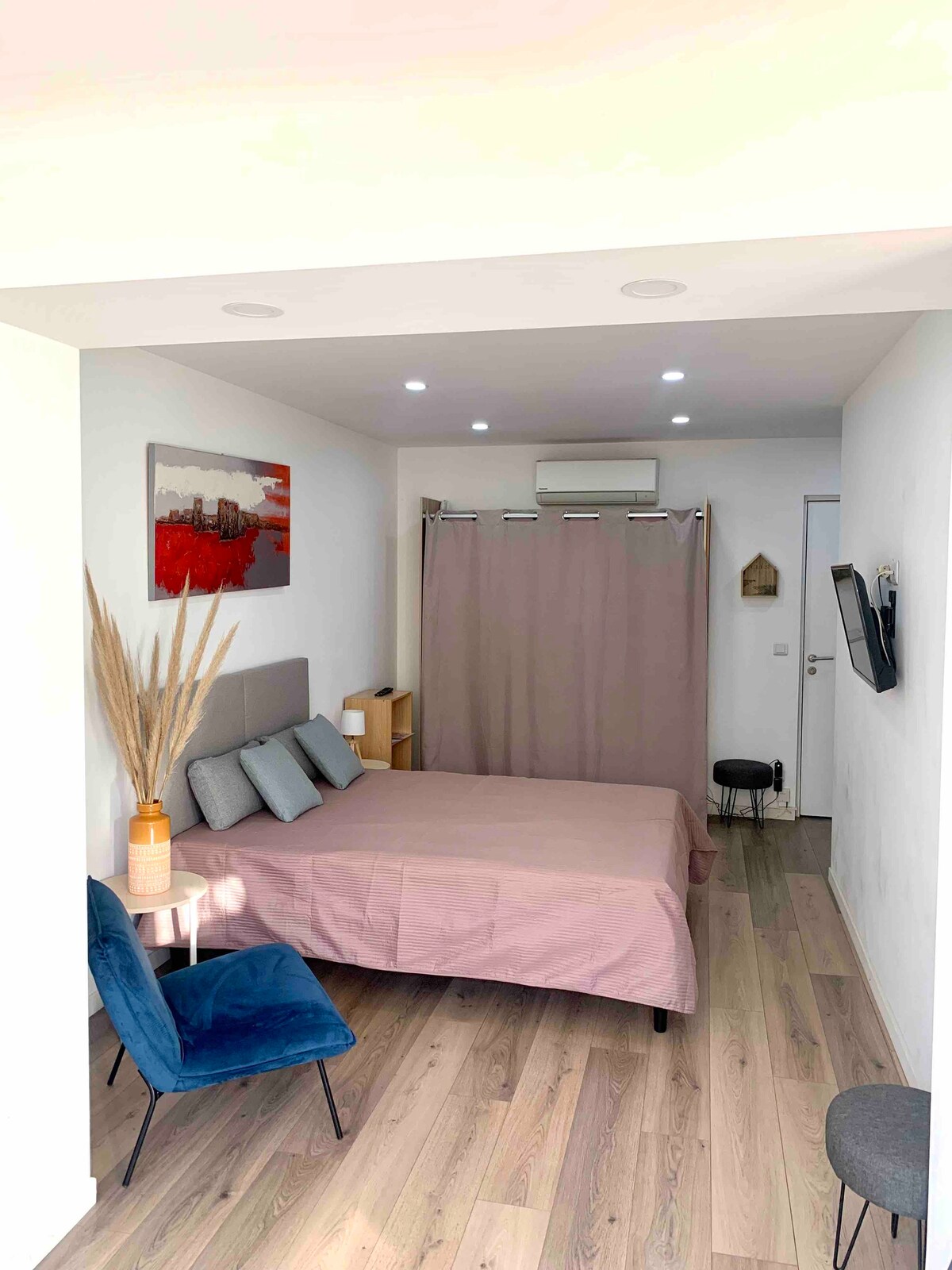 Ground floor studio, quality double bed, flat screen TV, dressing room, bathroom with walk-in shower, washing machine, equipped kitchen (oven, Dolce Gusto coffee machine, microwave, toaster, kettle), gas plancha, reversible air conditioning. In a wooded residence with swimming pool, tennis court, boules court, private parking. Close to all amenities on foot (beach, pedestrian streets, supermarkets, pharmacy, bakery).
