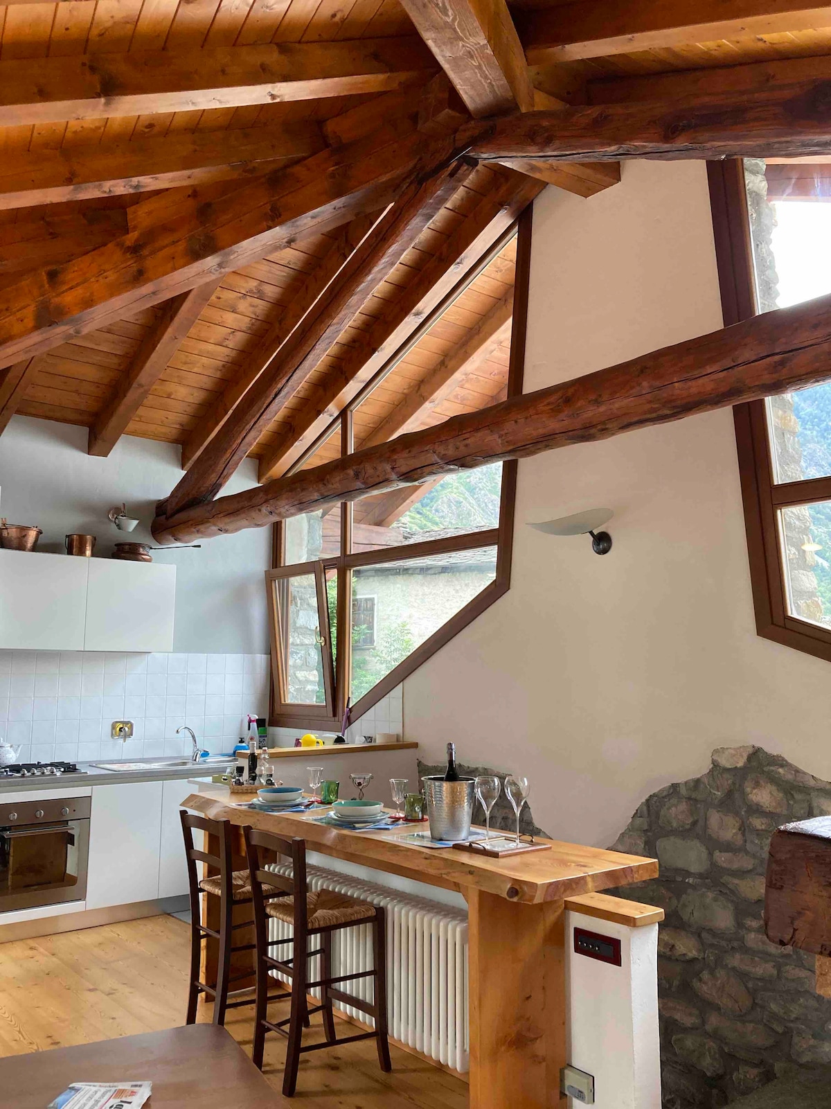 A 10-minute drive from Courmayeur, the conservative renovation of this "Ancient Baita" gives a unique and exclusive space. Independent cabin on three sides in a sunny village. Accommodation on two floors. Parking in front of the house, convenient and free. Ground floor: entrance, double bedroom with wood-burning stove and bathroom. First Floor: bright and panoramic living room with kitchen, working wood-burning fireplace, high ceilings, large windows and two balconies with open views of the valley and mountains.
