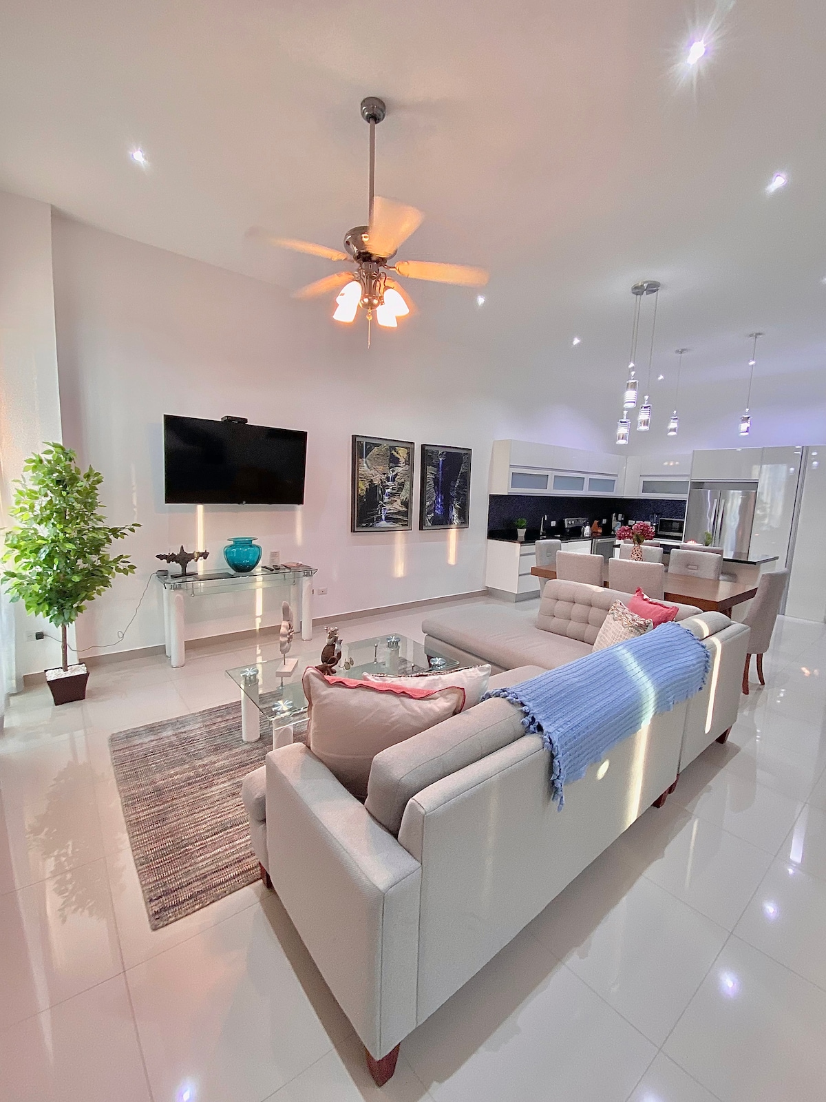 Our condo in Las Gavias Grand Resort has two bedrooms and two full bathrooms + a 2 person sofa bed. There is an open living room/dining room/fully equipped kitchen, and a balcony overlooking the ocean. The resort has an infinity pool, with jacuzzies and barbeque area right on the beach front. It also includes a game room, movie theater room, and sauna/steam room. The resort is ideally located in the quiet resort of Cerritos, very close to Marina, with great beaches, restaurants, and bars.