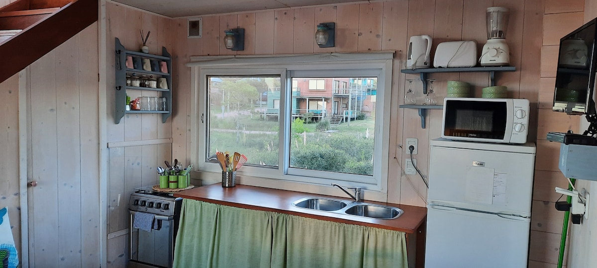 The property consists of three cabins surrounded by nature in a very quiet area, an 800-meter walk from La Viuda Beach. The cabins are decorated with designer objects created by us and designed for our guests’ enjoyment. Two wooden cabins, ideal for couples and family, sleeps up to 4 people. A single environment with bathroom and private terrace in maritime container, ideal for couples. Custom care and guaranteed privacy. Thank you for choosing us! Fabiana and Miguel