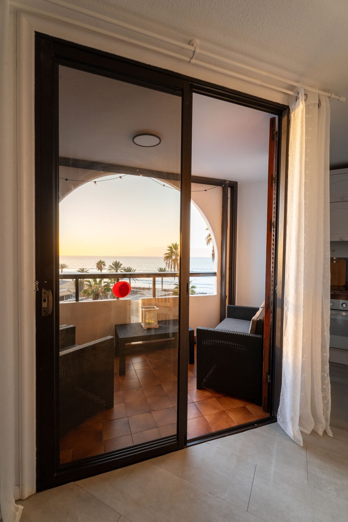 You'll be a two-minute walk to Playa de las Vistas, from the balcony overlooking the sea and the beach. It has 47m2 well distributed, air conditioning, 58" Smart TV, 100Mb fiber optic Internet, computer work desk. Fully equipped kitchen: Refrigerator, Electric oven, Microwave, Washer, Dryer, Nespresso, blender, etc. Everything you need for a wonderful stay! Bedroom with air conditioning and a bathroom with a rain shower. A very quiet area.