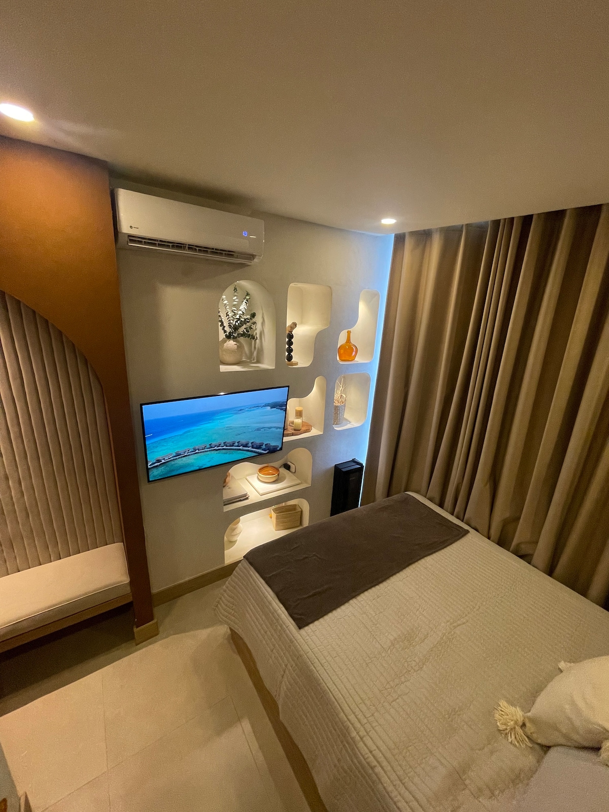 Majestuoso apartamento para parejas con una habitación con excelente decoración su baño cómodo, en el nuevo y exclusivo condominio Morros EOS con acceso directo a la playa, ubicado en el prestigioso Proyecto de Serena del Mar sector manzanillo a tan solo 17 Km de la ciudad amurallada y a 10 minutos de Aeropuerto, además 3 minutos de la plaza comercial Las ramblas con múltiples locales comercial y restaurantes.