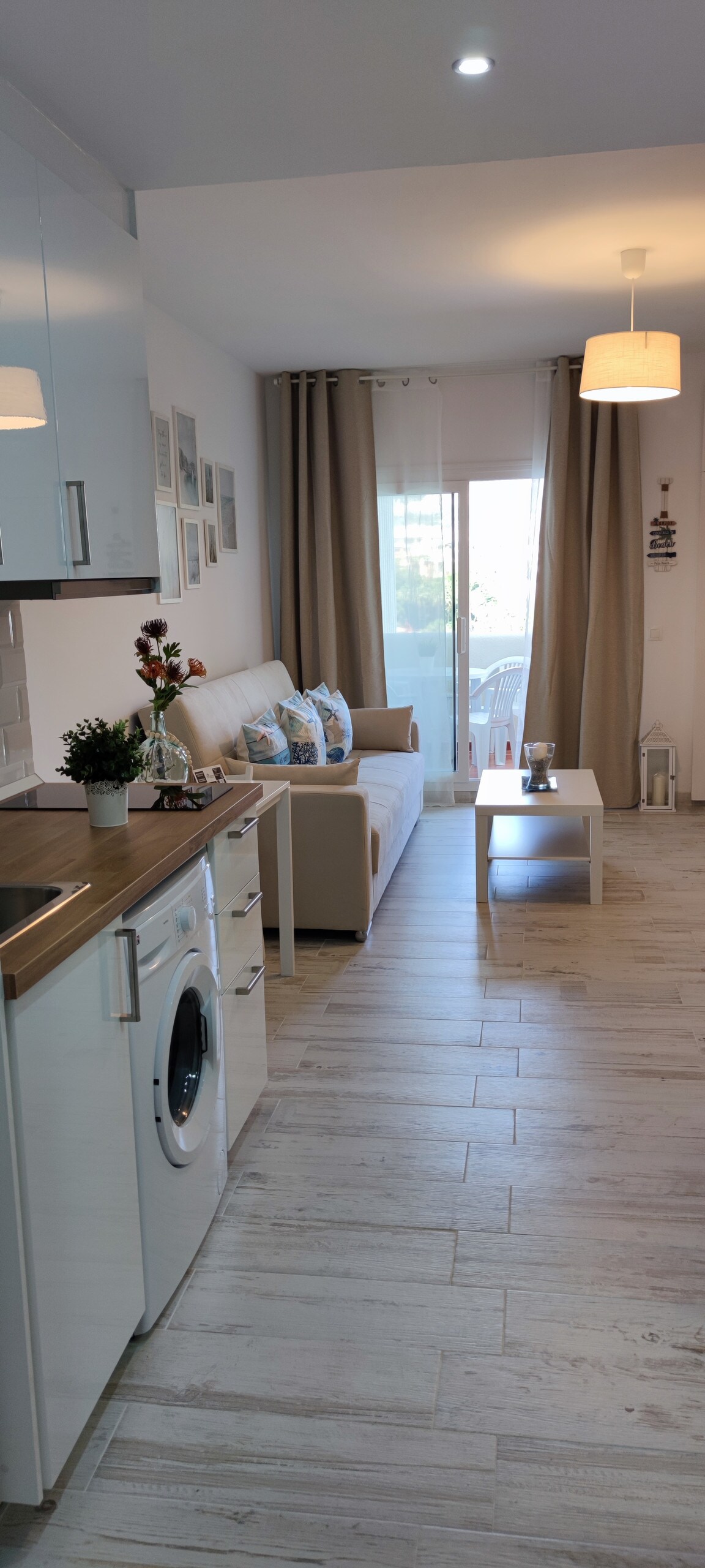 Enjoy a stylish experience in this centrally-located apartment. 3 minutes walk to downtown Benalmadena with all the bars, restaurants, shops. 15-minute walk - 5-minute drive to the beach. It is completely renovated with all services such as wifi, smart TV, washing machine, dishwasher. Very modern decor with a sofa bed. The building has a 24-hour reception with a doorman. It has a swimming pool and community parking and a small pool (open from June 1) for children and a small bar next door.