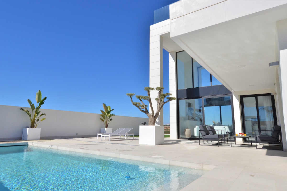 Golf, beach, bars, restaurants, big city or quiet relaxation. Bring your family or friends and enjoy this elegant residence. The brand new luxurious villa has a range of amenities. Private garden and pool area with various seating areas, sunbeds and barbecue, perfect for outdoor relaxation. You can enjoy three floors with a large roof terrace where you can enjoy the view of the city and the sea. Air conditioning and fast internet. We offer 3 double beds 160*200 and 4 single beds 90*200.