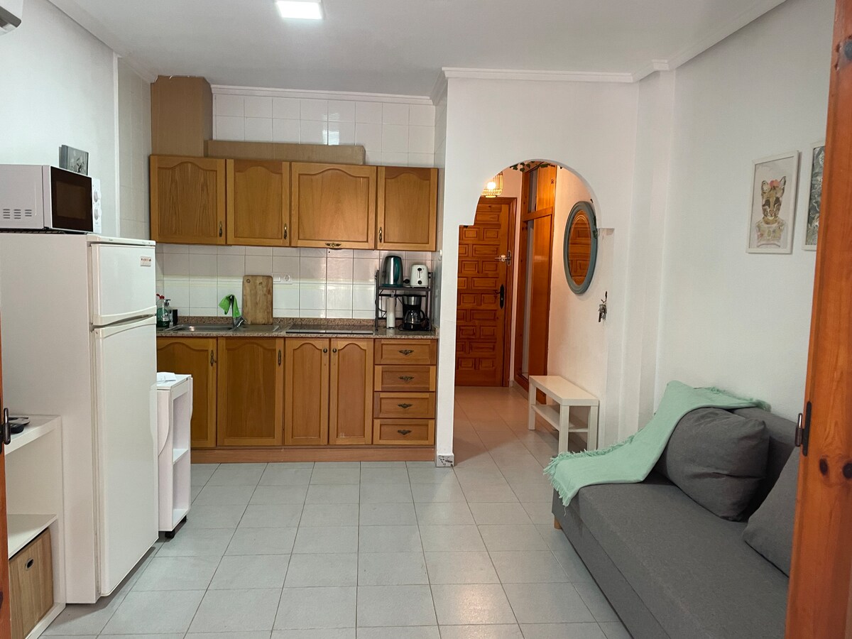 Bright and newly renovated Studio apartment located in the most touristic area of Torrevieja right on the promenade with views of Playa del Cura beach. It is suitable for 2 guests and it is fully equipped (appliances, washing machine / dryer, bed linen, towels, kitchenware) with WIFI and air conditioning. Due to the Spanish regulations we will need a photo ID or passport uploaded into the Airbnb platform before the check in day.