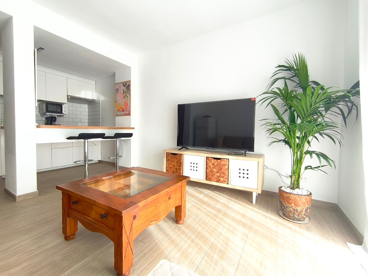 Moderno, luminoso y tranquilo para 2 personas. Céntrico pero en una zona tranquila (zona de Playa Bastian), en un complejo con 2 piscinas, una de ellas a solo unos pasos del apartamento, un jardín muy cuidado y a solo 5 minutos andando de la playa y del paseo marítimo. El apartamento consta de un dormitorio, un baño moderno con ducha italiana, un salón amplio y luminoso con un ventanal grande , una cocina abierta y una terraza con mesa y banco.
