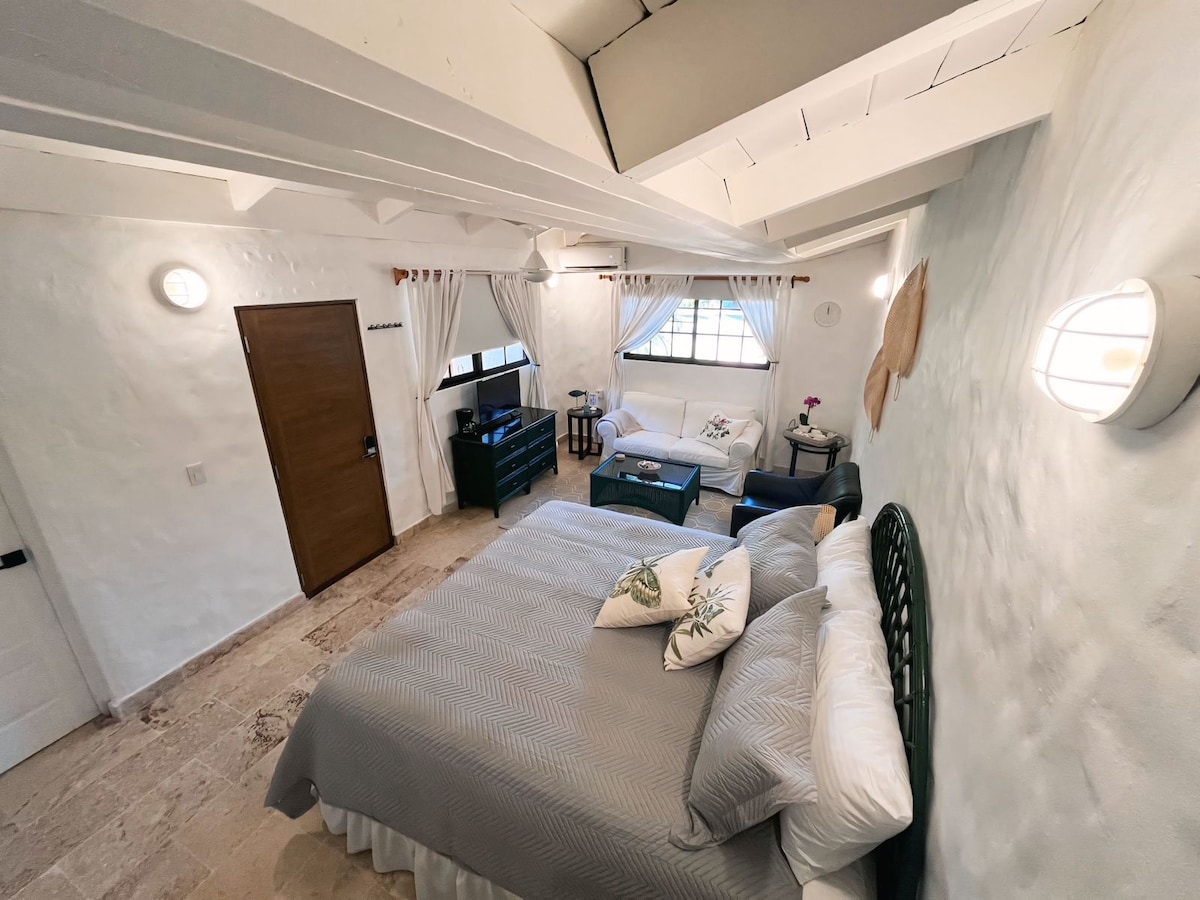 Enjoy an unforgettable stay in this cozy suite with a private entrance located within walking distance of the iconic Minitas Beach in the prestigious Casa de Campo resort. Ideal for two, the room features a seating area, flat-screen TV, coffee maker, microwave, and fridge. Step outside to your private outdoor space, where you can relax in a hammock, enjoying the sound of the birds and the Caribbean breeze. It's the ideal retreat to disconnect and enjoy a paradise-like setting.