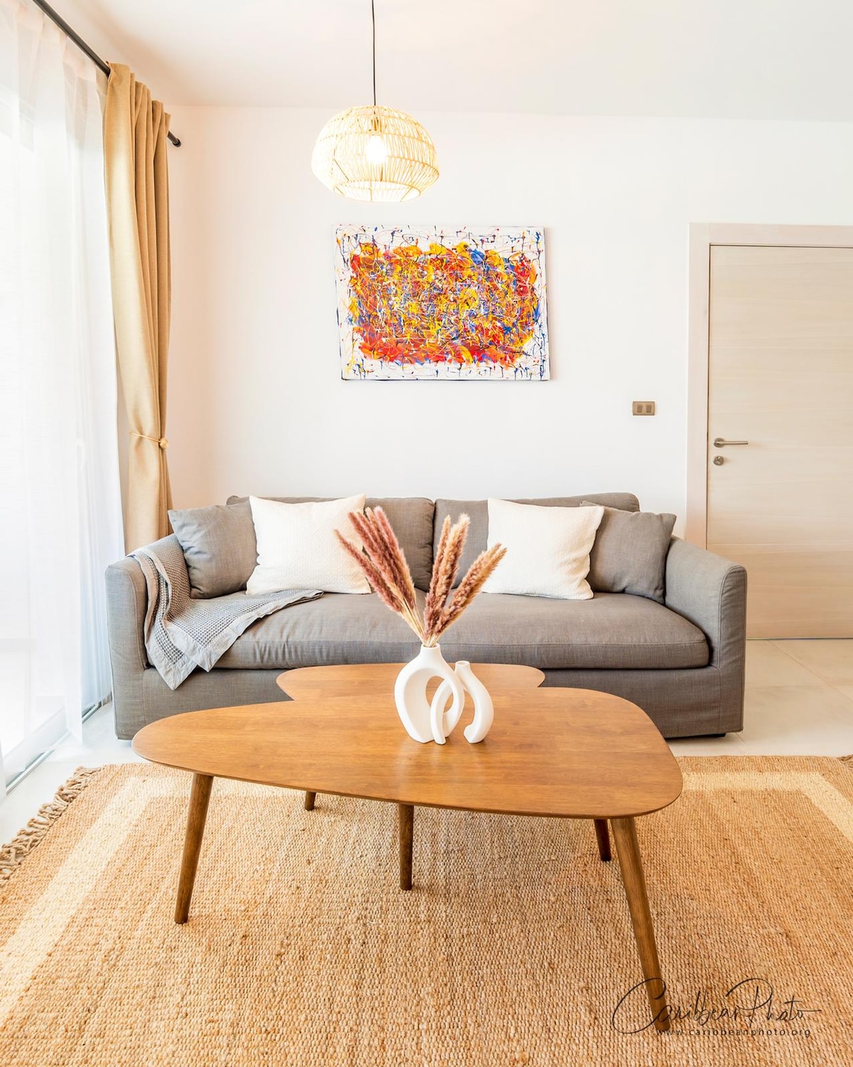 Relax in this centrally located quiet space. In an exclusive residence, a charming 76 m2 apartment equipped with every comfort for an unforgettable holiday in total tranquillity. The apartment consists of a bathroom with shower and bidet, laundry area, bedroom with walk-in closet and balcony, a large living area with kitchen and living room, equipped with a double sofa bed, which overlooks a wonderful terrace overlooking the ocean pool.