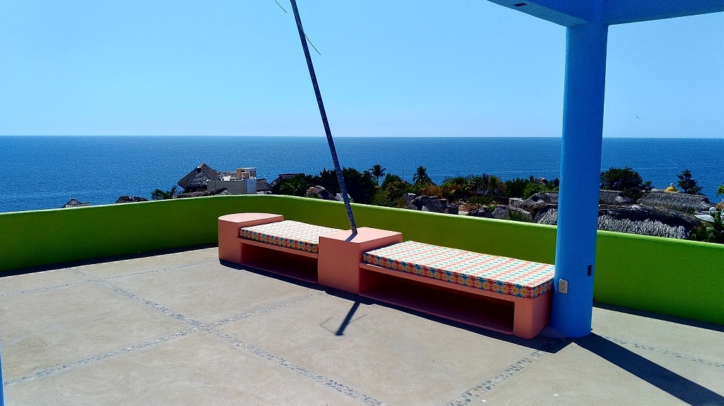 The studio apartment called Hugh offers a stunning ocean view. It is a small, cozy and comfortable studio that includes one queen size bed, equipped kitchen, private bathroom with hot water, air conditioning, television with cable tv, wifi and an ocean view deck overlooking Zicatela beach. This apartment is located on the top floor of a two-story building. Access is by stairs with one section of 14 low steps.