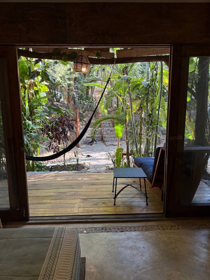Casa Dora Bungalows. Starlink & fiber optic. Ideal for remote workers, long stays. In San Agustinillo, 1-mn walk to beach, spacious 60m2 apt has BR with queen bed, work space, hammock. Completely screened, ceiling fans, purified drinking water, safe. 6-min walk to Hridaya. Organic market in Mazunte. Stroll on beach, rent moped, snorkel on small beaches. Light carbon footprint. Ecological, we recycle all water, compost. No pets, no AC. Smoke-free. **Monthly rentals**