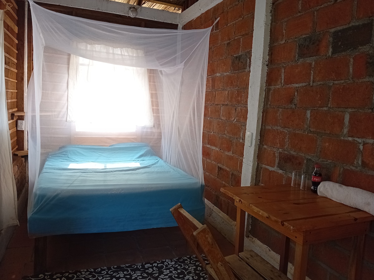The Cabaña Rinconcito, a few meters from the beach, has 2 double beds, hammocks, WIFI, purified water, its own equipped kitchen, refrigerator, and private bathroom. Surrounded by trees, their animals and birds, one feels part of nature. If you like camping, this rustic cottage with its palm roof will be for you. The bedroom has a mosquito net over its comfortable bed, and also the bed downstairs in the living room. There is sea view from the hammocks in the room.