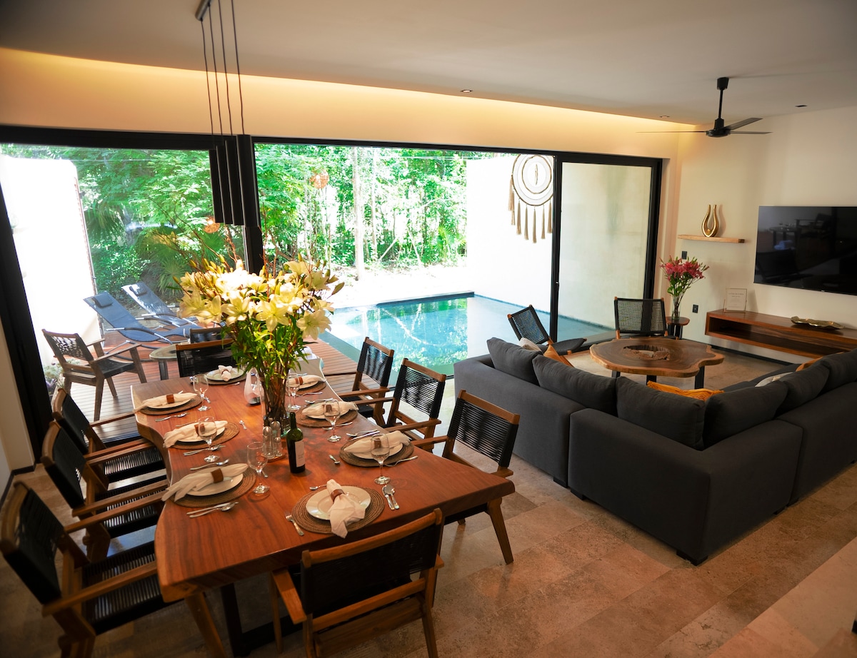 WELCOME TO THE JUNGLE! Jungla 3 House is a spectacular cristal-cubism designed house surrounded by nature-10 min from DT -6 min to the beach. Double gated security, very safe area. Back garden next to the pool,5 terraces to enjoy breathless sunrises & sunsets. Connect your beautiful energy with nature & sacred mayan land, watch exotic birds, meditate while listening to the fountains, watch the stars in a hammock, enjoy the huge pool around trees & birds and relax in the bathtub watching sunset.