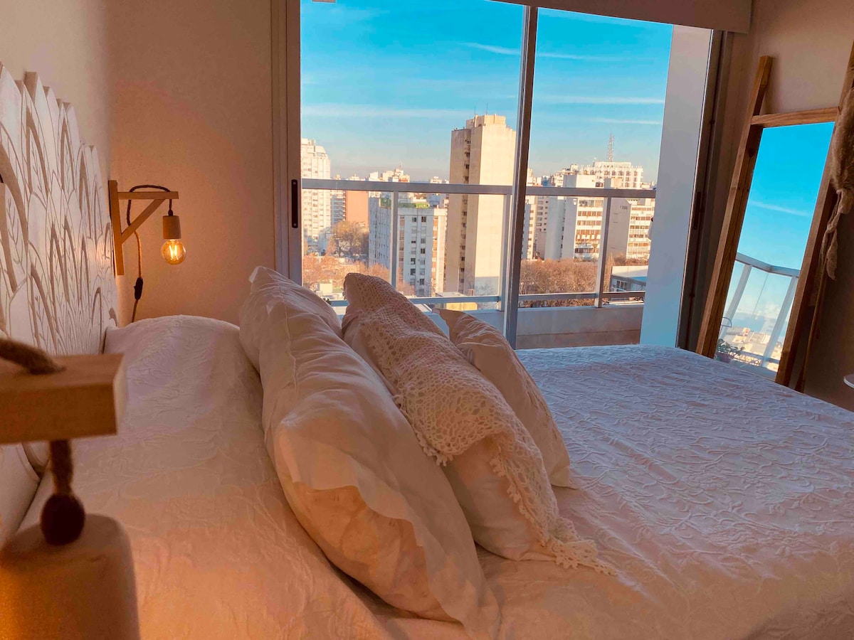 Beautiful and practical semi-floor overlooking the city's main attractions. Prepared for 2 people. Excellent location. On the top floor you can enjoy the SUM, laundry, kitchenette, service bathroom, terrace with grill and solarium with pool with spectacular views. It stands out for its privileged location 3 blocks from Calle 12, 2 blocks from Plaza Moreno and very close to the main Universities, Hospitals and government and ministerial offices.