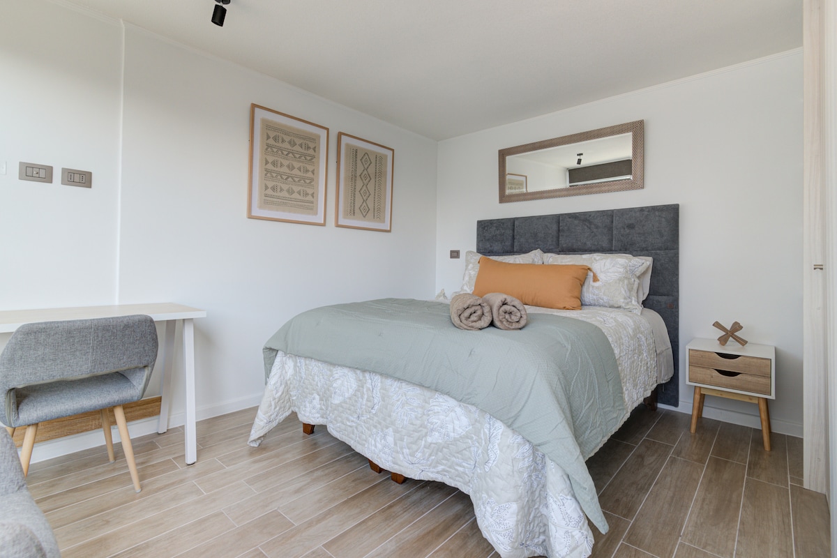 Modern apartment steps away from Plaza Ñuñoa and the Chile-España metro station. The interior design integrates the rooms, creating spaciousness, with an innovative proposal inspired by European boutique hotels. Relax in this quiet, comfortable, and elegant space. First underground parking, blackout roller curtains, fully equipped kitchen with ceramic hob, oven with built-in microwave, refrigerator, walk-in closet, thermo-panel windows, shower door, and much more.