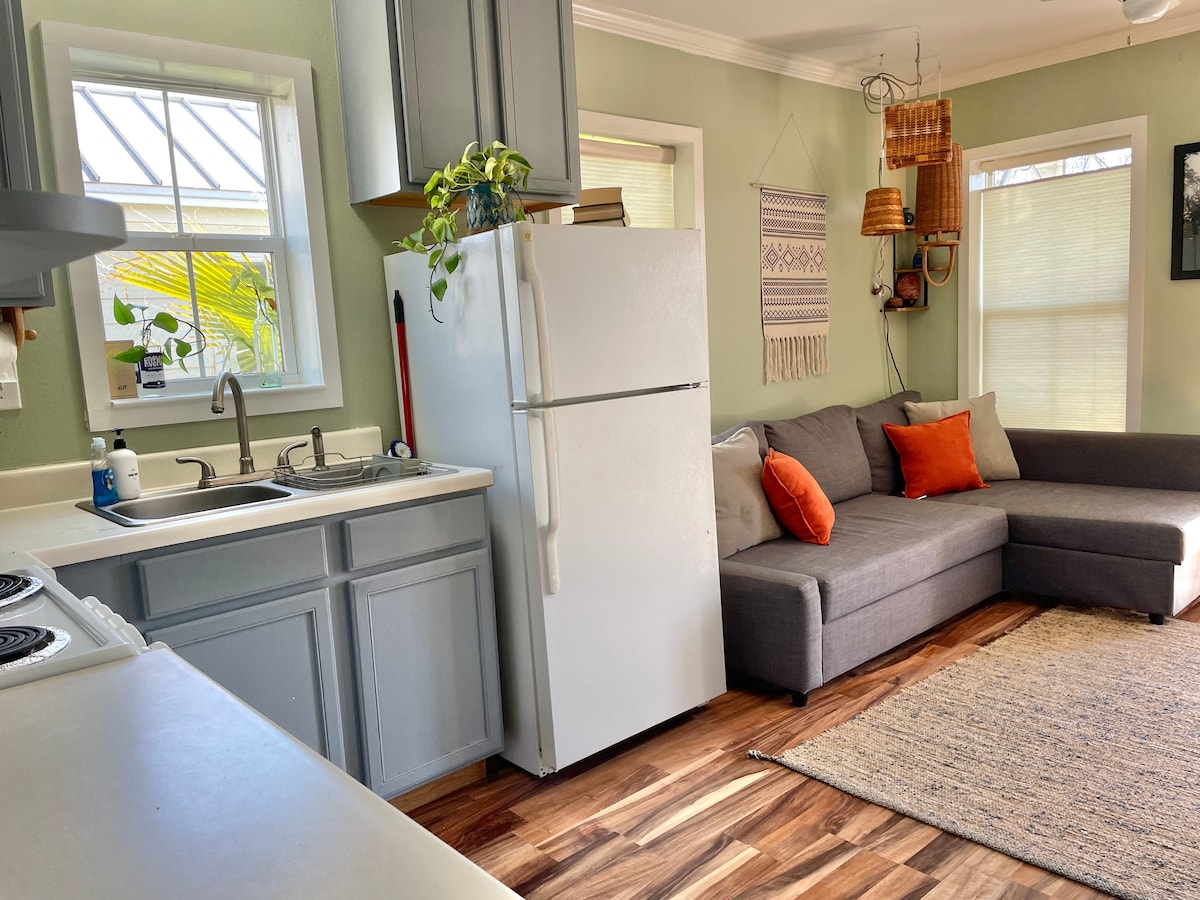 Situated perfectly between Austin's downtown and the airport, this charming cottage is the perfect hideaway for exploring Austin. Built-in the style of a New Orleans "shotgun house", the cottage is nestled among hackberry trees and sabal palmettos and catches the morning light perfectly for enjoying a cup of coffee on the front porch. A comfy cozy stay! -off street parking -walk to community park/pool -washer dryer -4 min to airport -full kitchen -drip coffee maker (coffee supplied)
