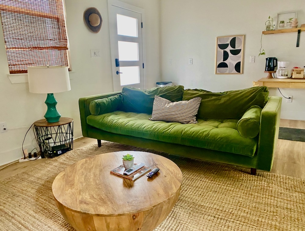 This super stylish, newly built home is just 3 minutes from the airport—hello, convenience! With free parking at your doorstep, coming and going is a breeze. You’ll find cozy vibes, comfy furniture, and a kitchenette ready for snack attacks or light meals. Whether you're catching a flight, exploring Austin, or just need a quick, comfy spot to crash—this place has you covered. Easy, cute, and perfectly located for your getaway! -complementary coffee and snacks -extra linens for third sofa guest
