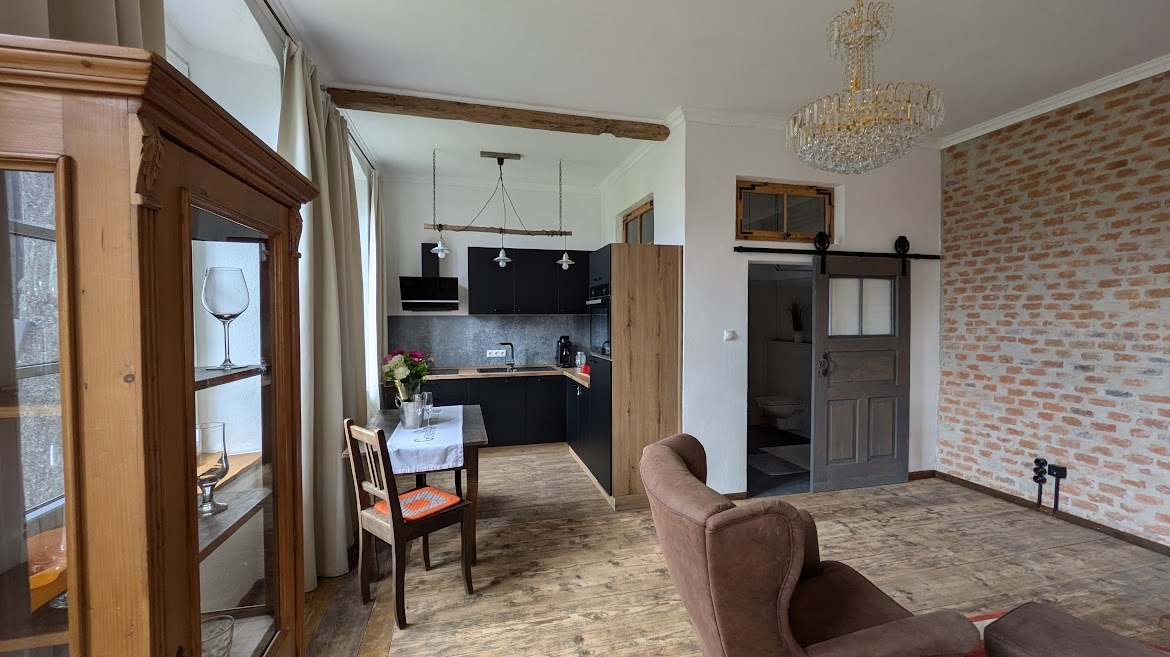 Detached flat in a historic house - first floor, access through shared corridor; windows overlooking picturesque historic square + castle view; spacious, refurbished bathroom + washing machine; two bedrooms; simple, older kitchen. If booked for 1-2 person(s), room no. 1 available (with TV); if booked for 3-4 persons, 2 bedrooms available (one without TV). Seating set for sitting outside the house on the square available. Basic price is for 1-2 persons, extra fee from 3rd person.