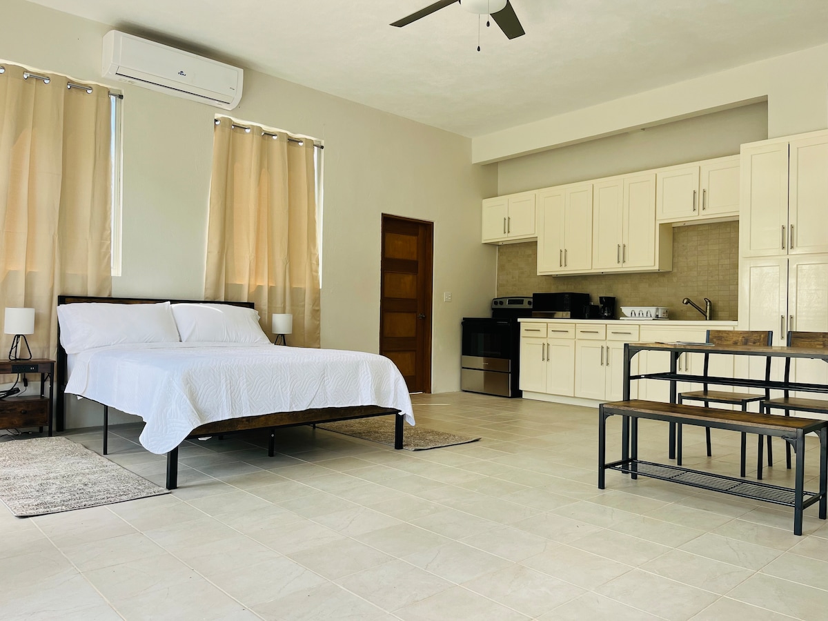 This cozy upper floor studio apartment is the perfect size for a couple looking for an idyllic beach vacation. Your accommodations are equipped with a king bed, wi-fi, TV and AC as well as a private bathroom w/ shower. The kitchen includes a cooktop, refrigerator, & microwave as well as an air-fryer. One of the longest and most romantic beaches in the Caribbean is just a 2 minute walk down the hillside. Your expansive balcony provides stunning views of the mesmerizing oceanfront vista.