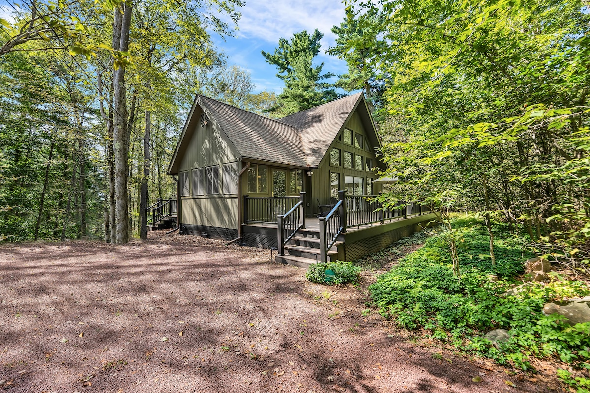 Just chill at our beautiful, remodeled cottage in the woods in the heart of the Poconos. The perfect place to relax with family and friends and connect with nature! We're just a short walk to North Beach of Lovely Lake Naomi. This home boasts comfortable beds, beautiful wood floors, newly remodeled bathrooms, fully equipped Kitchen, Dining room, Gas Fireplace, 2 decks, Gas Grill, Fire Table + Fire Pit. Centrally located in a quiet pocket in the heart of Poconos, adventures at your fingertips.