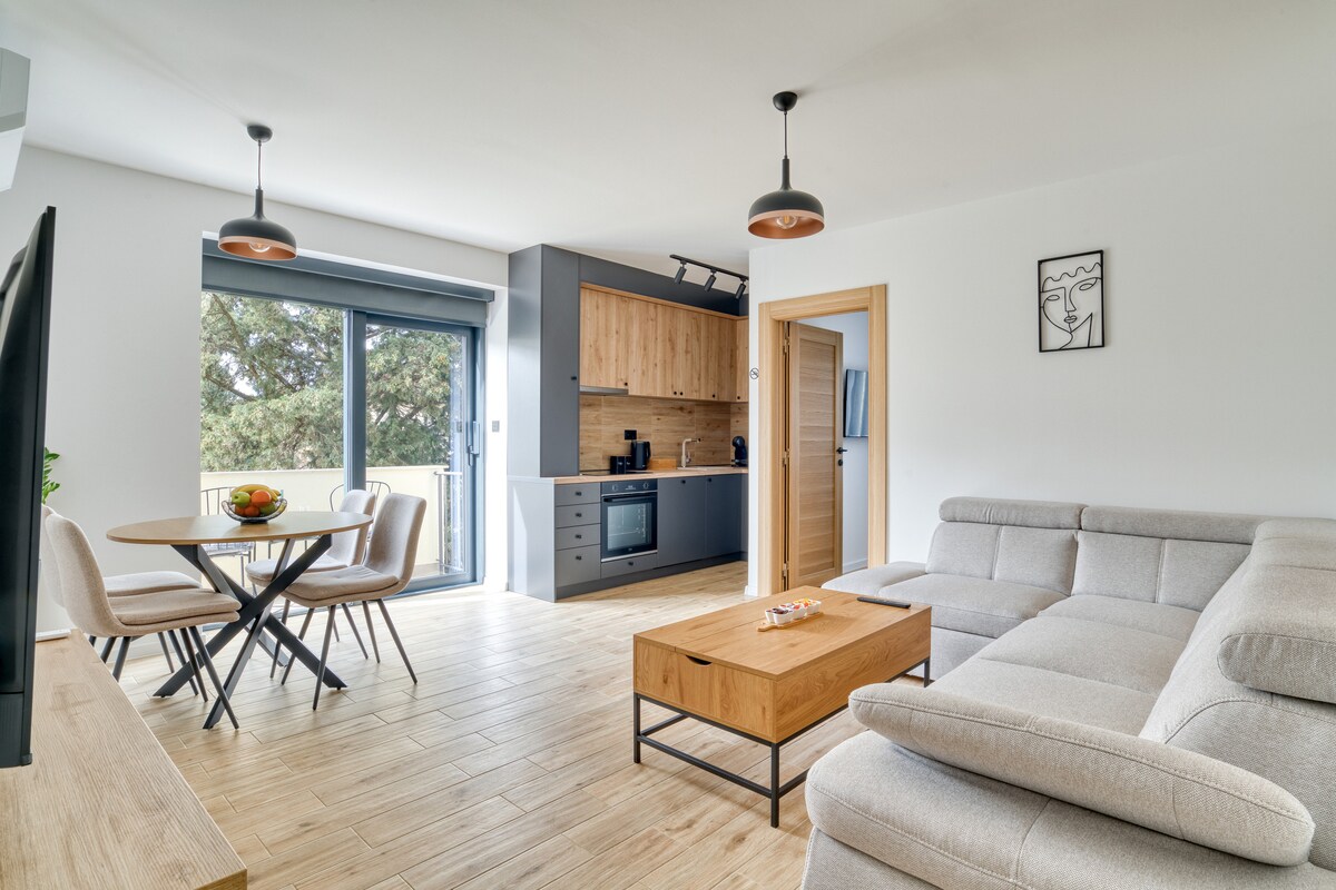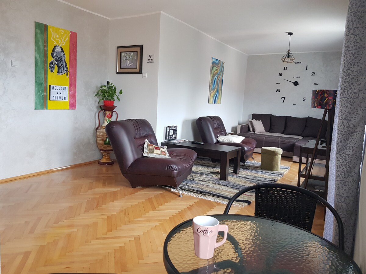 This stylish place to stay is perfect for group trips. Apartment is in ideal location in the most green and beautiful area. It has 80m2, two bedrooms, bathroom, toilet, two terrasses and free parking spot. In the building you can find pharmacy working 24/7 lots of supermarkets, caffes, banks, more than two ATM. It's 700m from the center of the town, less than 10 minutwalking distance from the river. All important spots in the town are very close. There are two bus stations and taxi stations.