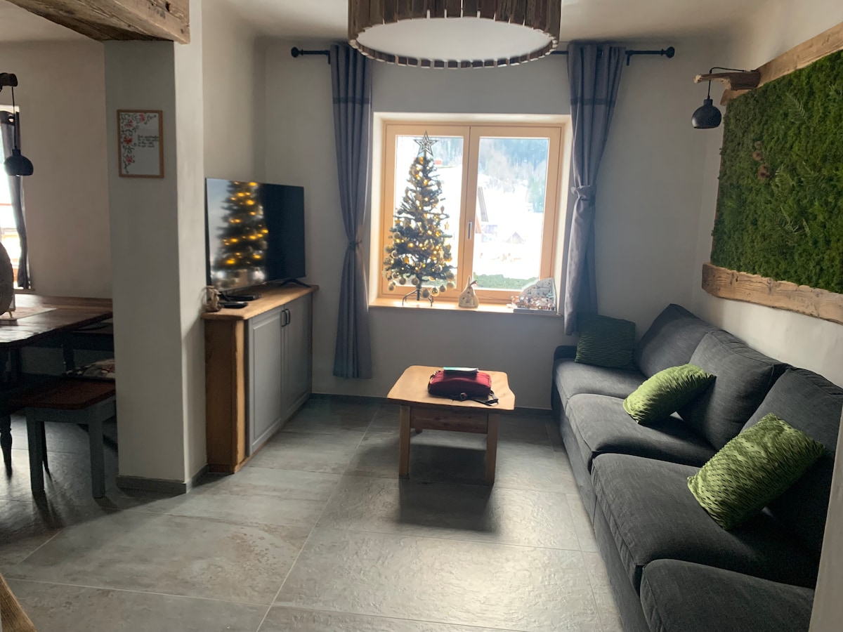 Whether you are coming because of our beautiful mountains, skiing, biking, hiking... this is your place to stay. Apartment on the upper floor of the house offers 2 rooms (1 with king size bed and a living room with an extendable sofa) that share a common balcony. Kitchen is equiped with all basic cookware and refrigerator. Roomy bathroom is equiped wit a washing machine. Every need that you might have will be taken care off. Welcome!
