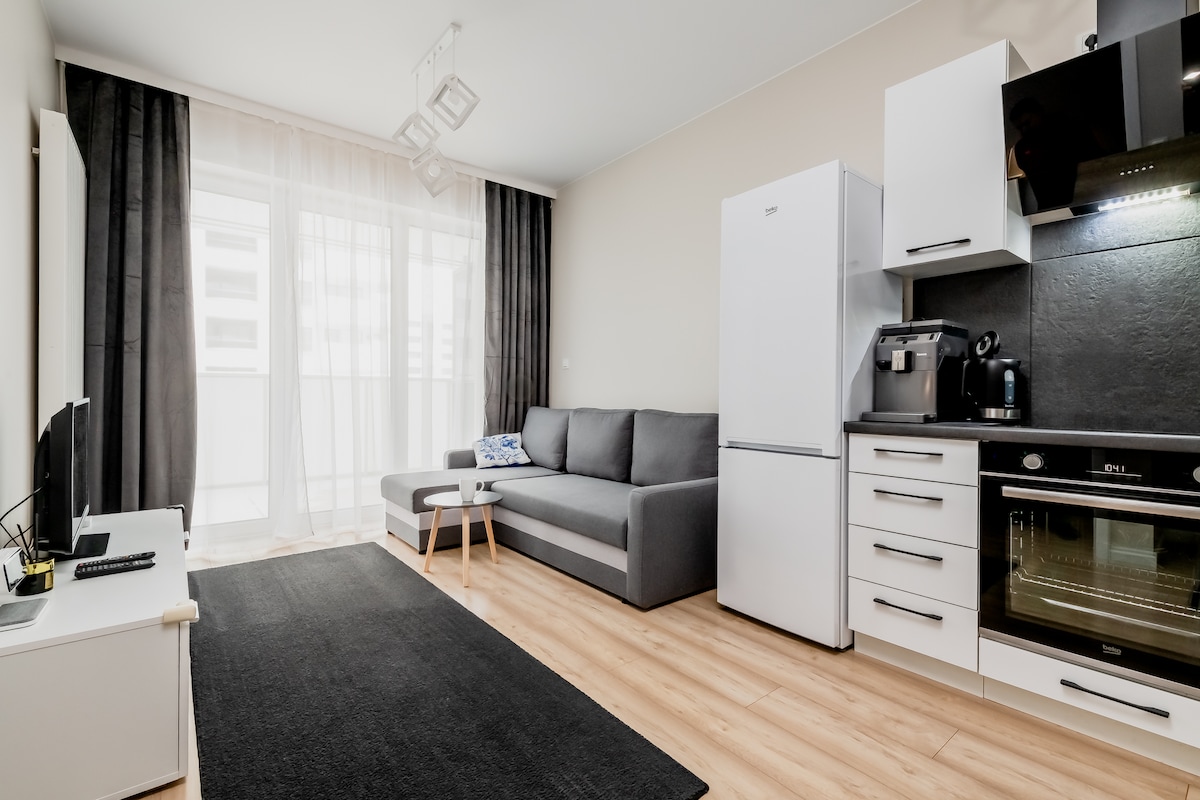 A modern 2-room apartment located in a prestigious skyscraper in the heart of the city. Nearby there is a shopping mall, swimming pool, cinema, gym, numerous restaurants The apartment is fully equipped and ready for your arrival – you will find a comfortable bed, a sofa bed, a fully equipped kitchenette, a coffee machine, a TV with terrestrial TV and Wi-Fi It is the perfect place for both a short getaway and a longer stay - for couples, families, business travelers or tourists.