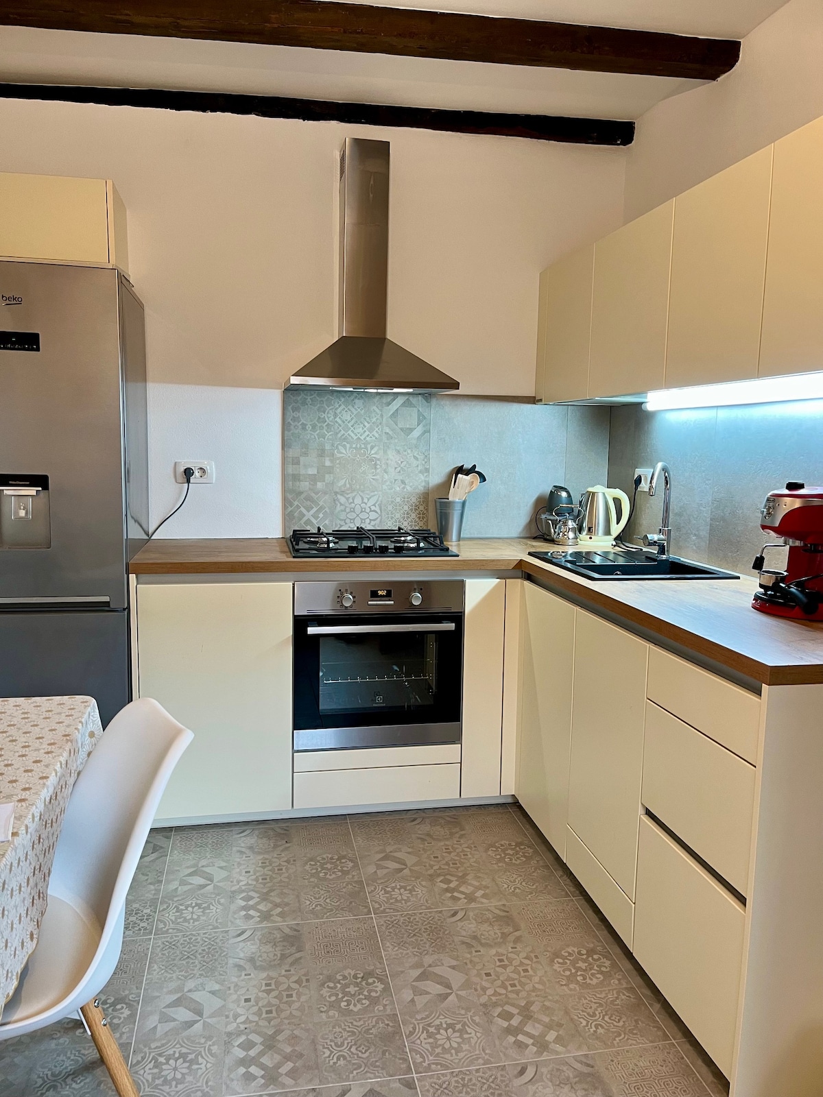 Stunning, over 100 years old stone barn, meticulously renovated, furnished with vintage pieces, located in a peaceful village in the middle of the upcoming Slovenian wine region. The fully furnished kitchen with all amenities and dining table area is located at the entrance, while the sleeping premises (one queen size bed and day-bed sofa for 2 and bathroom with a bathtub are on the upper level in an open-space attic. Free parking, Wi-fi coverage, AC, fan, autonomous entrance and garden access.