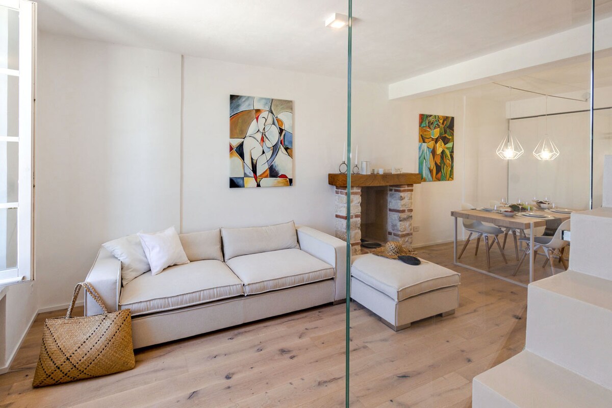 Enjoy a stylish vacation in this space enclosed within a historic building overlooking the square overlooking the sea from where it is possible on clear mornings, beyond the blue horizon of the sea, to see the profile of Croatia. The apartment is spread across two floors. the entrance, kitchen and living room make up a single space connected by a staircase to the upper floor where there are two double bedrooms and the bathroom.