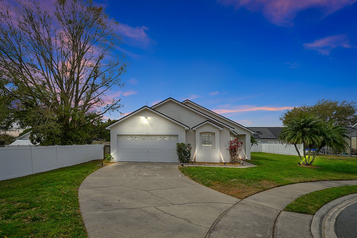 Sit back and relax in this stylish home with all the amenities you need for a fun family getaway. This home has a spacious layout with 3 bedrooms and 2 baths. We have thought of everything so you don't have to-toiletries,washer/dryer, and wifi. Enjoy your morning coffee in the screened in pool area with a beautiful sunrise and lake view or sip a glass of wine while floating in the pool. Just minutes to Theme Parks and major highways, this is the dream home you have been waiting for!