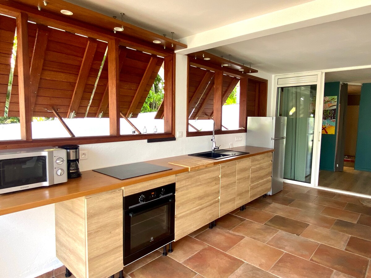 House, 180° view of the Caribbean Sea. Beach 50 meters away. Fully equipped kitchen (stove, microwave, dishwasher, washing machine etc...), air conditioning in the bedrooms, large 50 m2 veranda. Open bar on veranda. Deck with solarium and barbecue. Spacious rooms with storage. 2 bathrooms, 2 powder rooms. Living room and dining area on veranda. Free WiFi (fiber) Nearby busy road causing car noise during the day. This inconvenience disappears in the evening and at night.