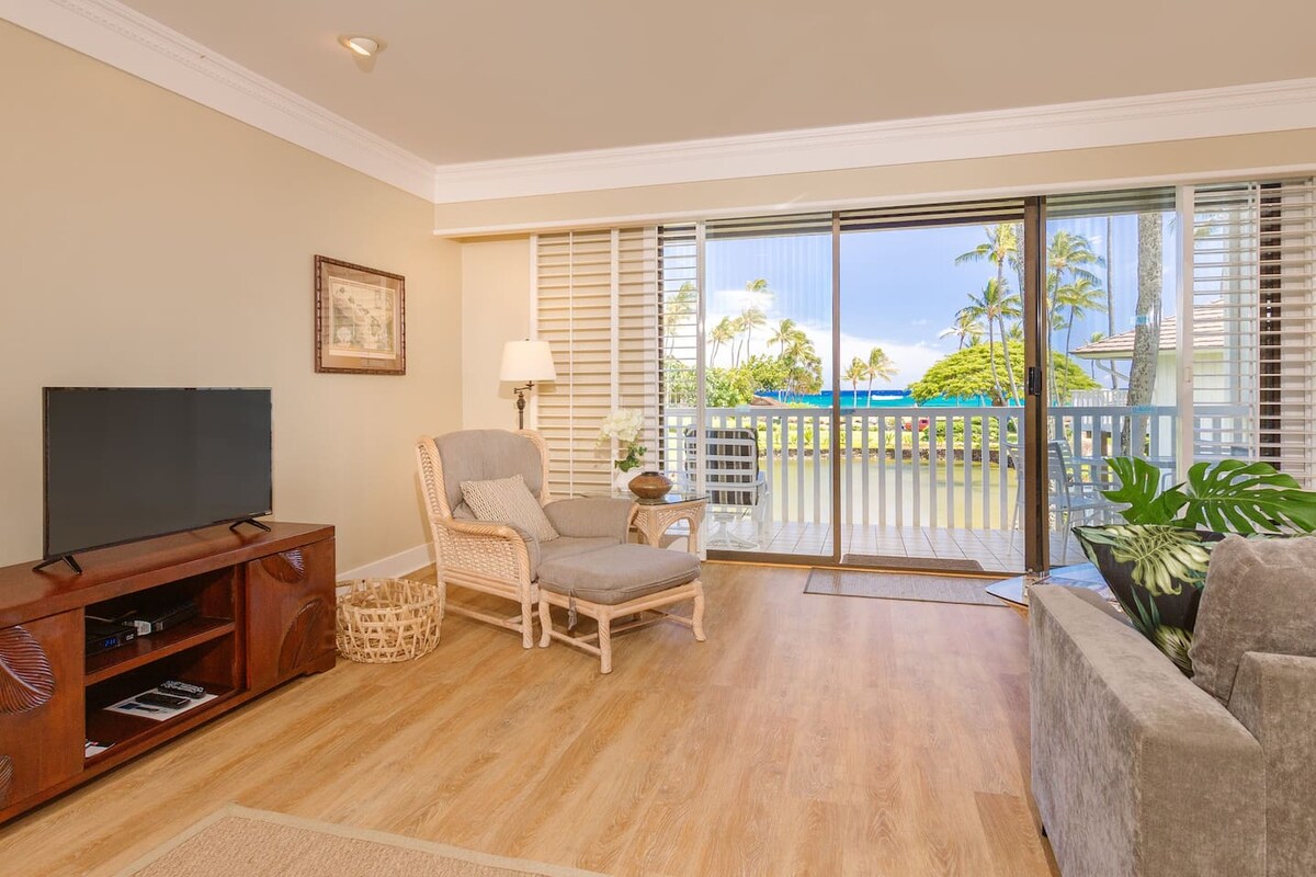 Charming, newly updated condo with AC, just steps from the ocean. Blending historic Hawaiian plantation style with modern comforts, this serene retreat is perfect for families, honeymooners, or anyone seeking a peaceful Kauai escape. Fully equipped for a home-away-from-home experience, the condo offers easy access to lush landscapes, stunning coastlines, and the island’s best attractions. Winter, spring, summer, or fall—you're sure to fall in love with this romantic, tropical getaway.