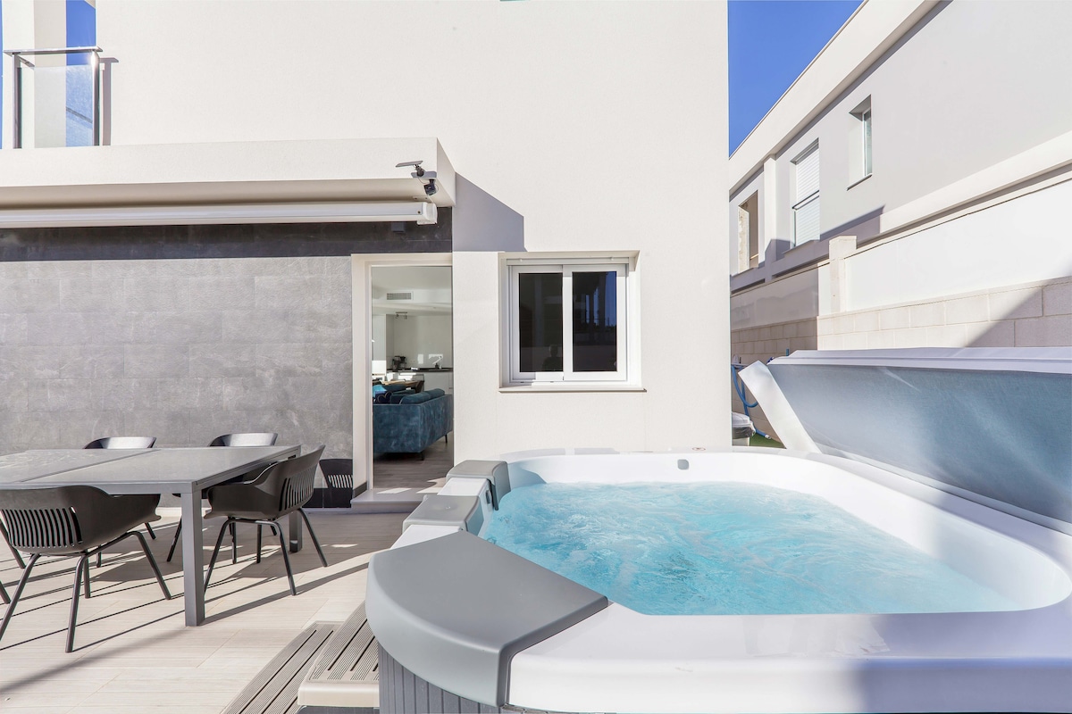Welcome to our chic villa in Gran Alacant, where luxury meets modernity. Private jacuzzi, pool, and exterior bar, three bedrooms, including a master suite, our villa accommodates up to six guests in absolute comfort. Spend your days soaking up the sun by the pool, at the exterior bar, or in the jacuzzi. Whether you're seeking a hip getaway with friends or a chic retreat with your loved ones, our villa in Gran Alacant is the epitome of cool.