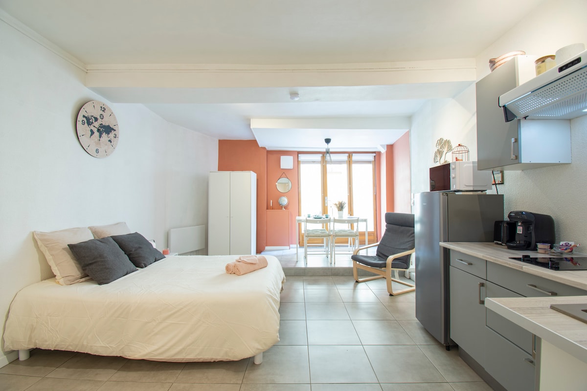 Brand new 21 m2 furnished studio with parking space, right next to my home. Cozy & modern interior, consisting of a foldaway bed (built-in comfort mattress), equipped kitchenette: microwave, stove, oven, coffee machine... A bathroom with Italian shower with toiletries provided, as well as towels and sheets. The Space: On the practical side, the studio is 15 minutes from Lyon St Exupéry Airport, 30 minutes from Lyon Centre and 1 hour from Annecy.