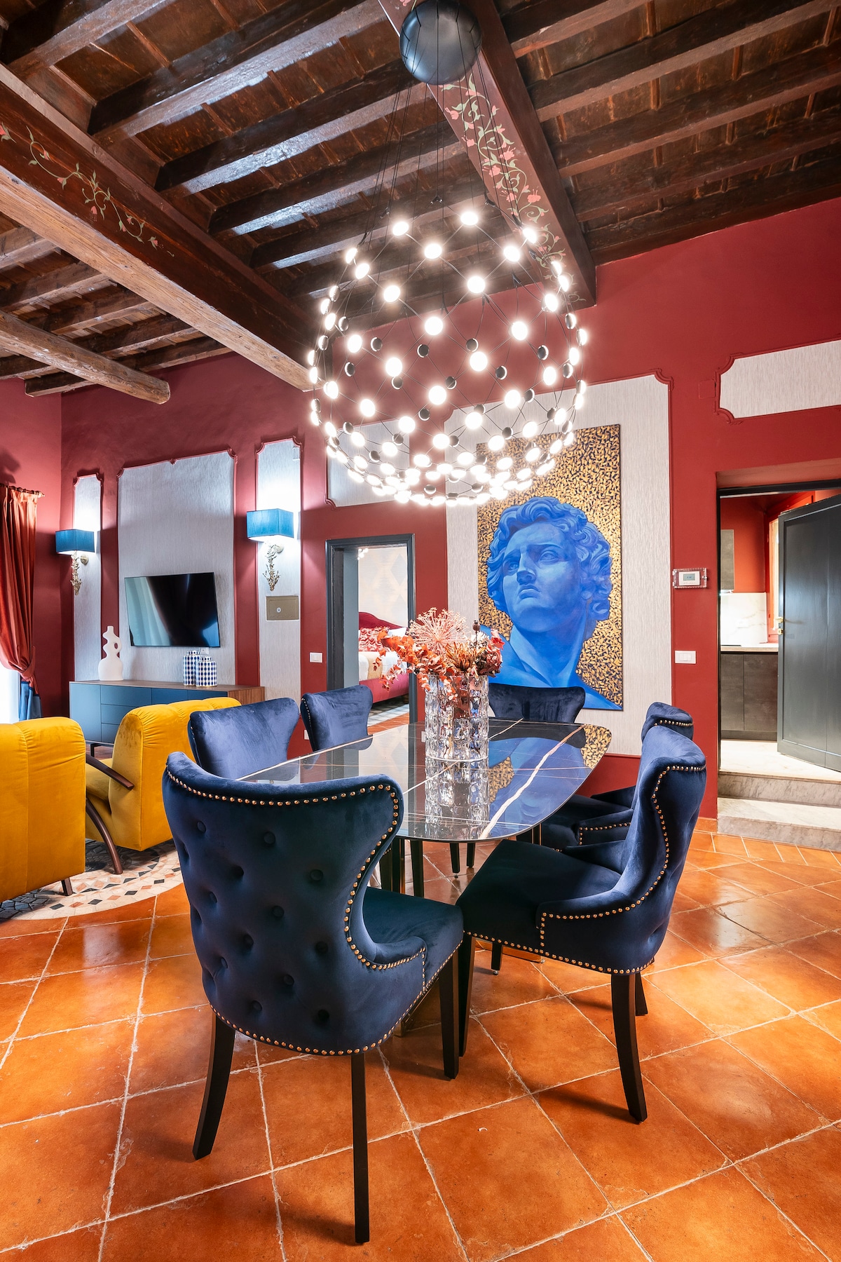 In the heart of Florence, David Suite offers a unique experience. Located in a 15th-century historic building, next to Via Tornabuoni and a stone's throw away from the train station, Duomo, Lungarno, and Ponte Vecchio, the accommodation features a king-size bedroom, marble bathroom, modern kitchen and an elegant living room with smart TV and air conditioning. Also available washer, dryer and balcony. With the comfort and luxury of our home, you'll fully enjoy the Florentine atmosphere!