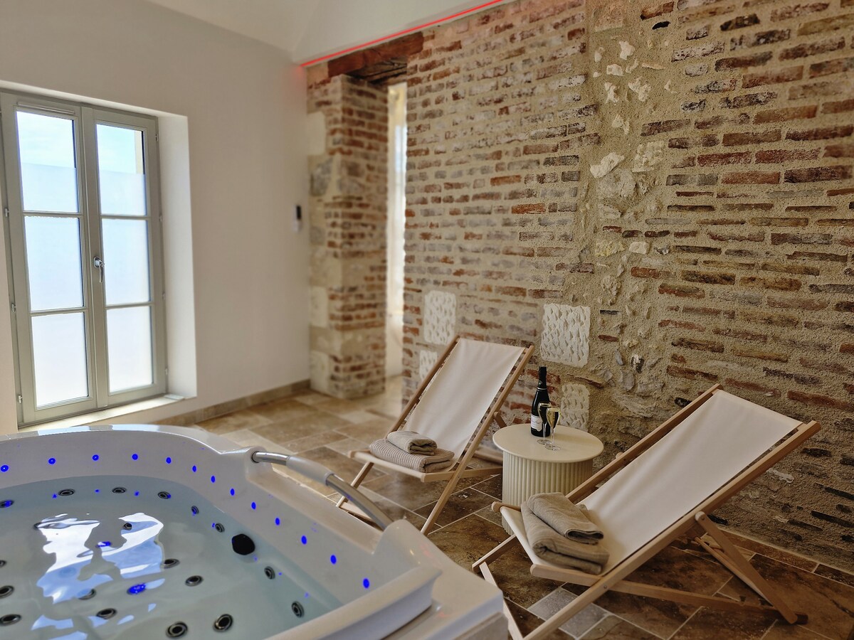 Maison semi troglodyte au charme romantique, idéalement située entre Tours et Amboise comprenant : - Pièce à vivre troglo : cuisine équipée (petit déjeuner pour séjours de 1 et 2 nuits), séjour et salon. - Suite non troglo : chambre et salle d'eau, literie Emma 160 cm, douche à l'italienne. - Espace bien être privatif en illimité avec spa , sauna infrarouge, et table de massage (modelages corps sur demande et en option auprès d'une spécialiste professionnelle des soins bien être
