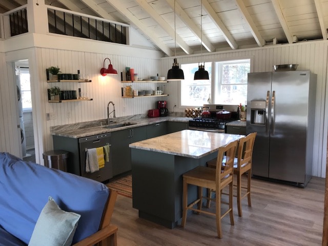 • Perfect for small families or couples, our signature A-Frame cabin features a modern interior gas burning fireplace, soaring ceilings, huge windows, stylish interiors, and all the comforts of home. • This cozy 1,100 square foot space comfortably accommodates up to four guests in two bedrooms (one with a King-size bed and the other with a Queen-size bed) and a shared bathroom. • 7 minute drive to downtown Freeport. • Proud to be ranked in the top 1% and voted Guest Favorite!