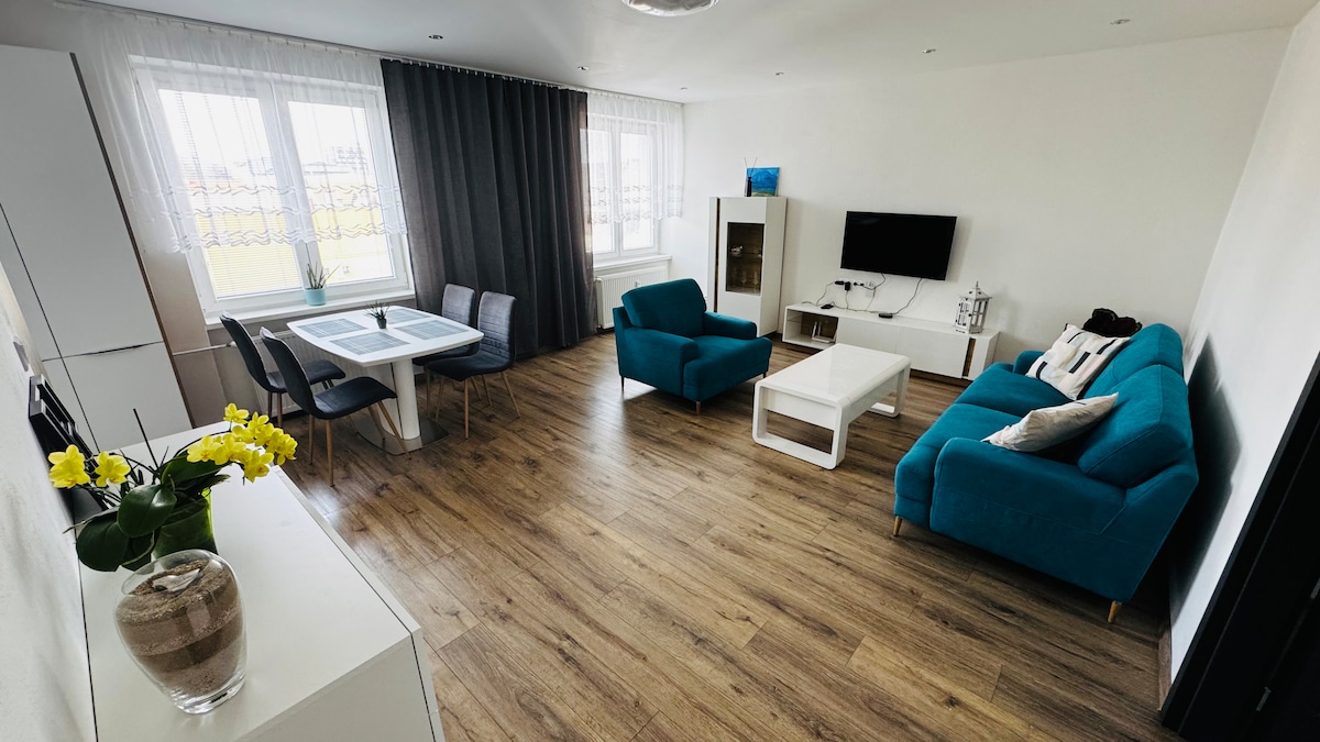 Modern 2-room apartment (54 m²) in the heart of Poprad. Spacious living room with pull-out sofa and flat-screen TV with SkyShowtime, fully equipped kitchen, cozy bedroom with plenty of storage and balcony access, and modern bathroom with bathtub. Self check-in for flexible arrival, Free WiFi, Free parking available. A quiet apartment in a central location. Shops, restaurants, and cafés just steps away. Aquacity aquapark 750 m away. Train station with access to the High Tatras a 10-minute walk.