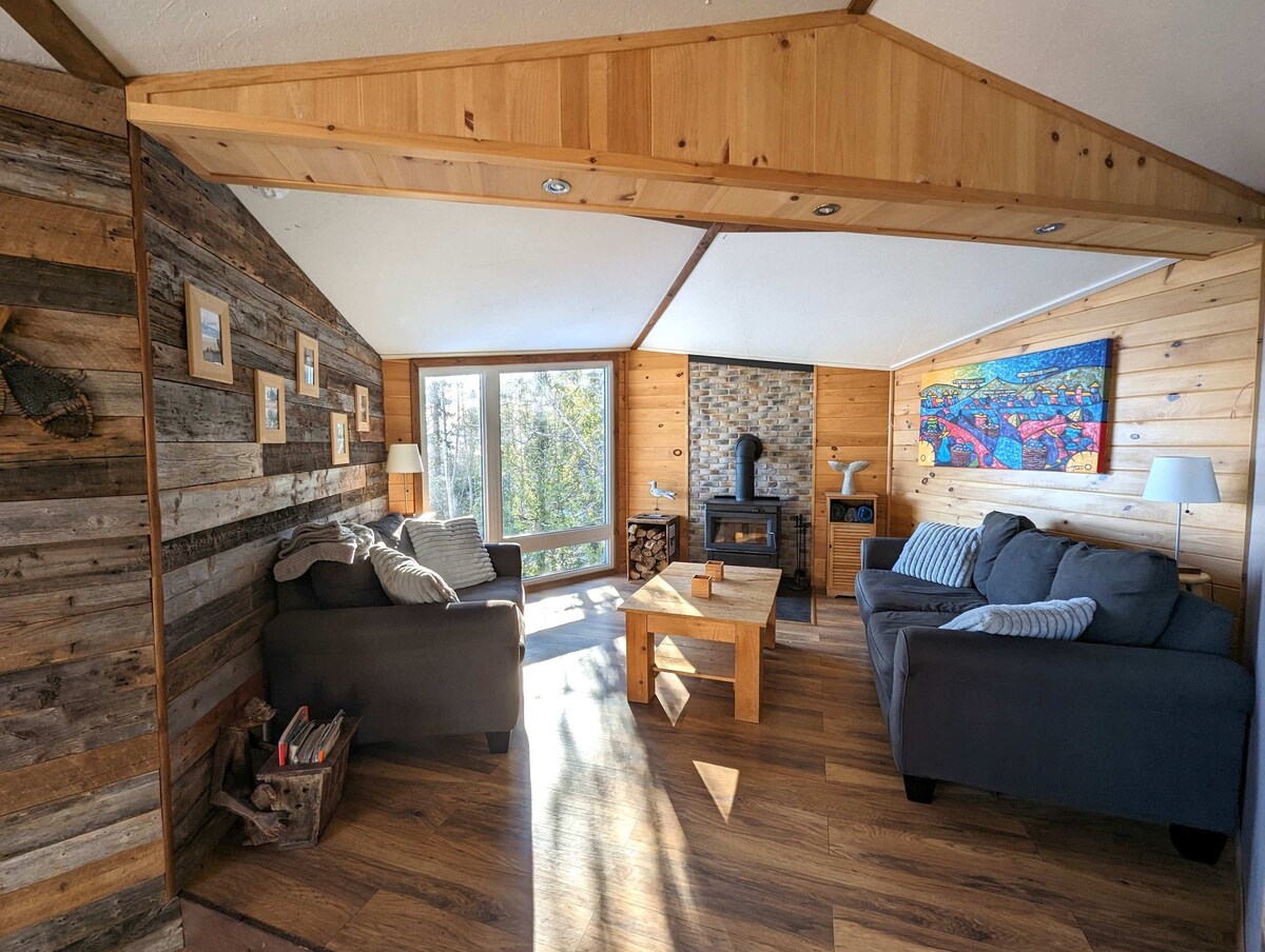 Small Scandinavian chalet for two people ideally located to enjoy the attractions of Charlevoix. It has a thermal circuit (hot tub, sauna, hammam) Very intimate and in the middle of the woods, the view overlooks the majestic river and the mountains in the distance. All the modern equipment is there and the comfort is absolute A/C and outdoor fireplace. The open concept design was designed for an immersive experience in nature: large windows, panoramic shower. Access via a private road at 500 m.